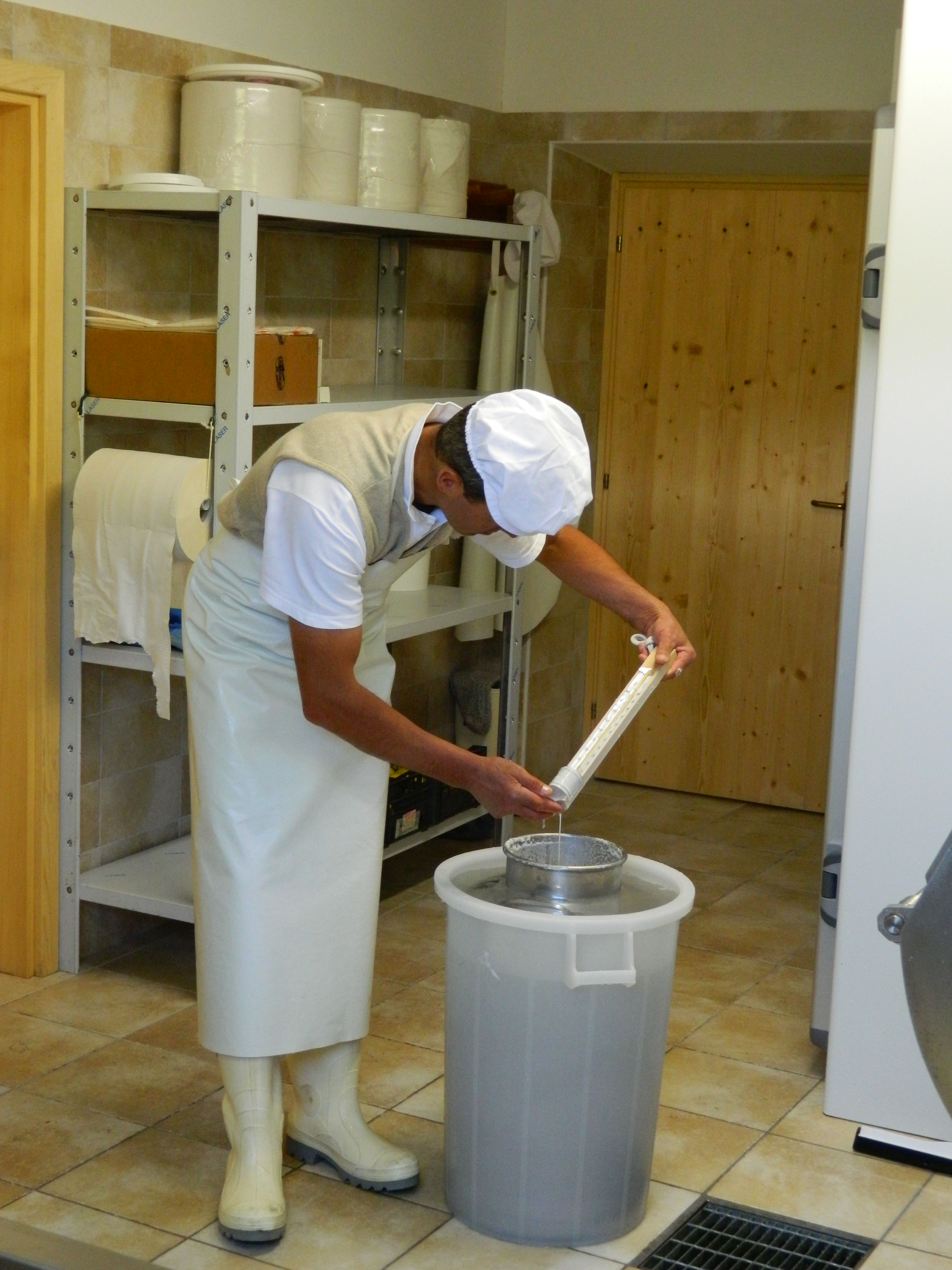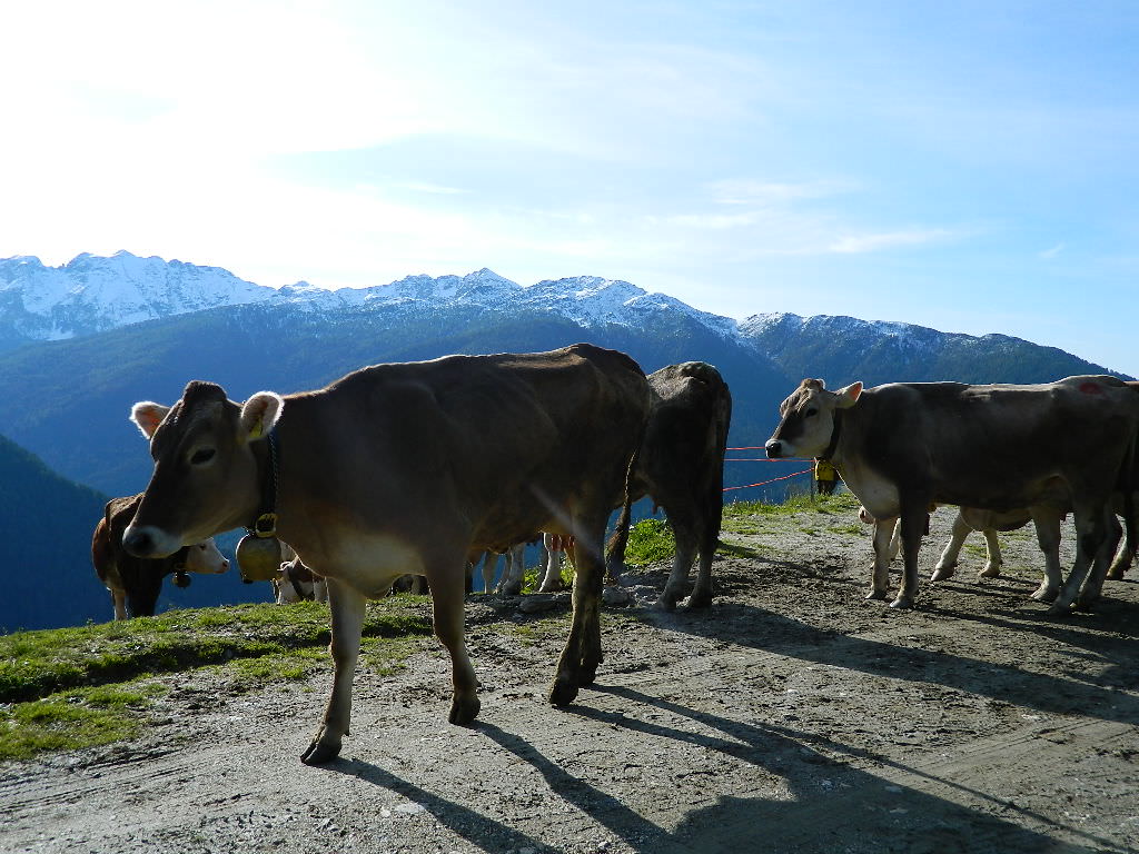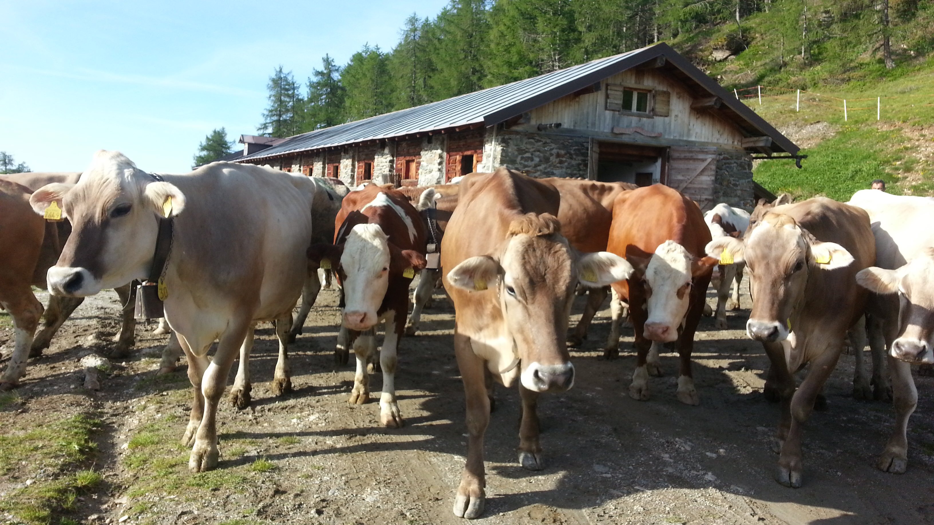 Il malgaro Dimitri con sua moglie Lily ci aspetta, l’ora della mungitura sta quasi per finire, ma arriviamo in tempo per godere del privilegio dei ritmi locali. Il latte fresco appena munto sarà sul tavolo della colazione, insieme alla panna appena affiorata, ai formaggi, alle marmellate artigianali e ad una deliziosa tisana di fiori estivi del Maso S. Romina. Ma è ora di far uscire le mucche dalla stalla e lasciarle pascolare. Campanacci e muggiti sono gli unici suoni che si possono ascoltare da queste parti. Intanto, sono le 7 ed è già ora di fare il burro.